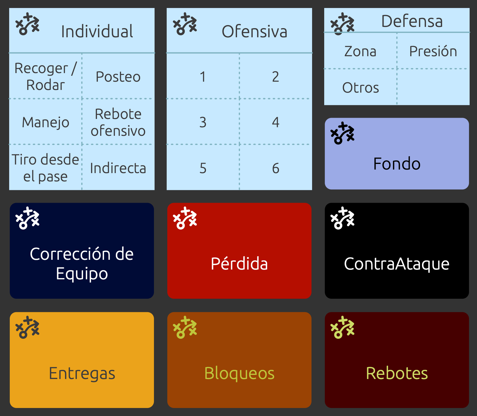 Categorías: Añade categorías principales como Ataque, Defensa, Transición, etc, con sus respectivas subcategorías. Esto lo que permite, es añadir información más detallada de cada acción, es decir, puedes añadir la información de la acción y su finalización.
